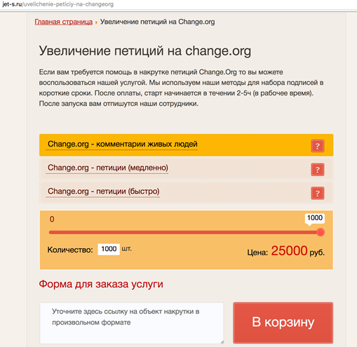 1,000 real-people petitions on change.org for US$400; 100,000 petition