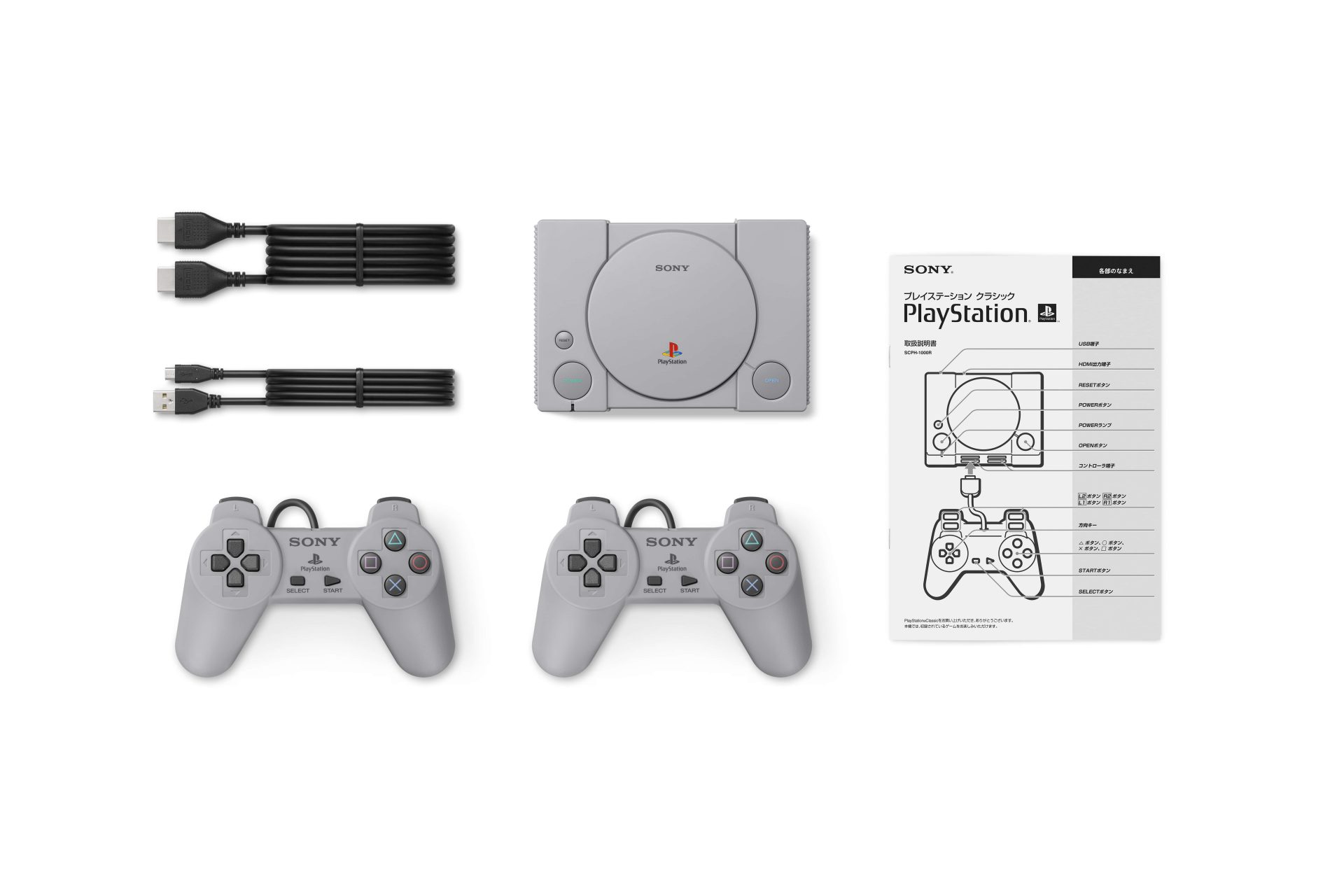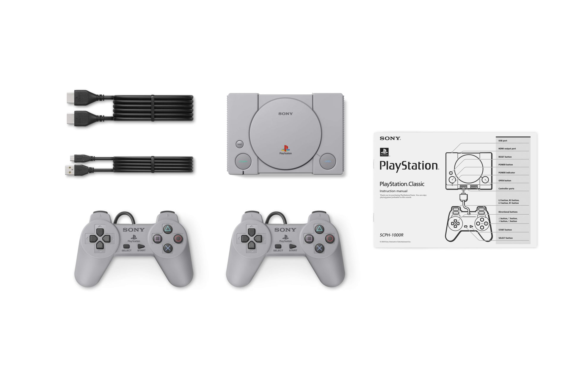 The PlayStation®Classic includes a HDMI™ cable for connecting to external displays such as TV monitors, and a USB cable which needs to be connected to a commercially sold USB AC Adaptor for power supply from a plug. On selected supported titles, users can play with or against their friends, with the two Controllers included with the console.