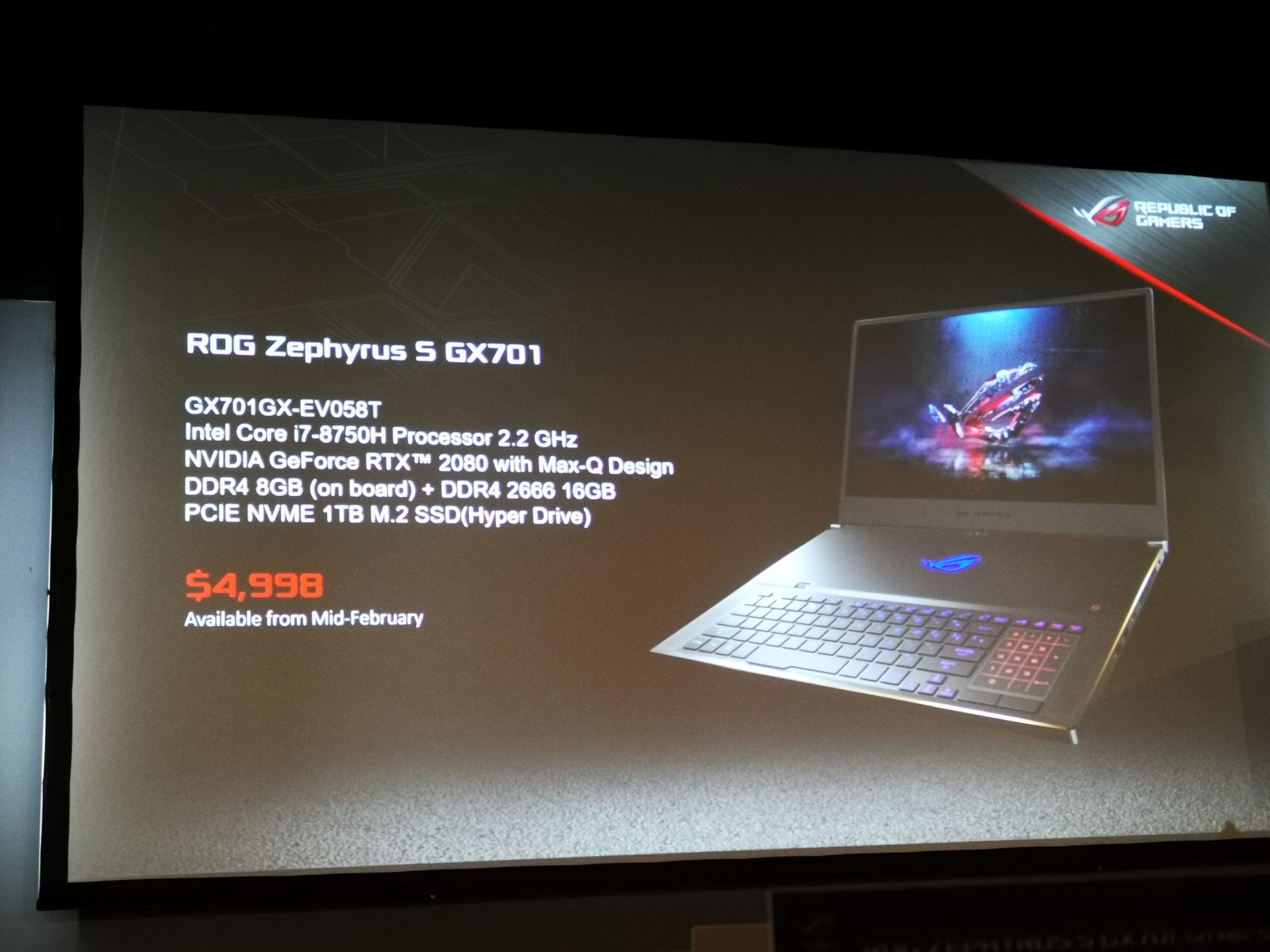 The ROG Zephyrus S (GX701), an ultra-slim gaming laptop that takes hardcore gaming to the next level with the new NVIDIA® GeForce RTX™ 2080 GPUs with Max-Q design and 8th Generation Intel® Core™ i7 processor. The ROG Zephyrus S (GX701) features a 17-inch display with a 144Hz 3ms refresh rate, and frames it with super-narrow bezels. It also adds NVIDIA® G-SYNC™ and Optimus™ technology into the mix.
