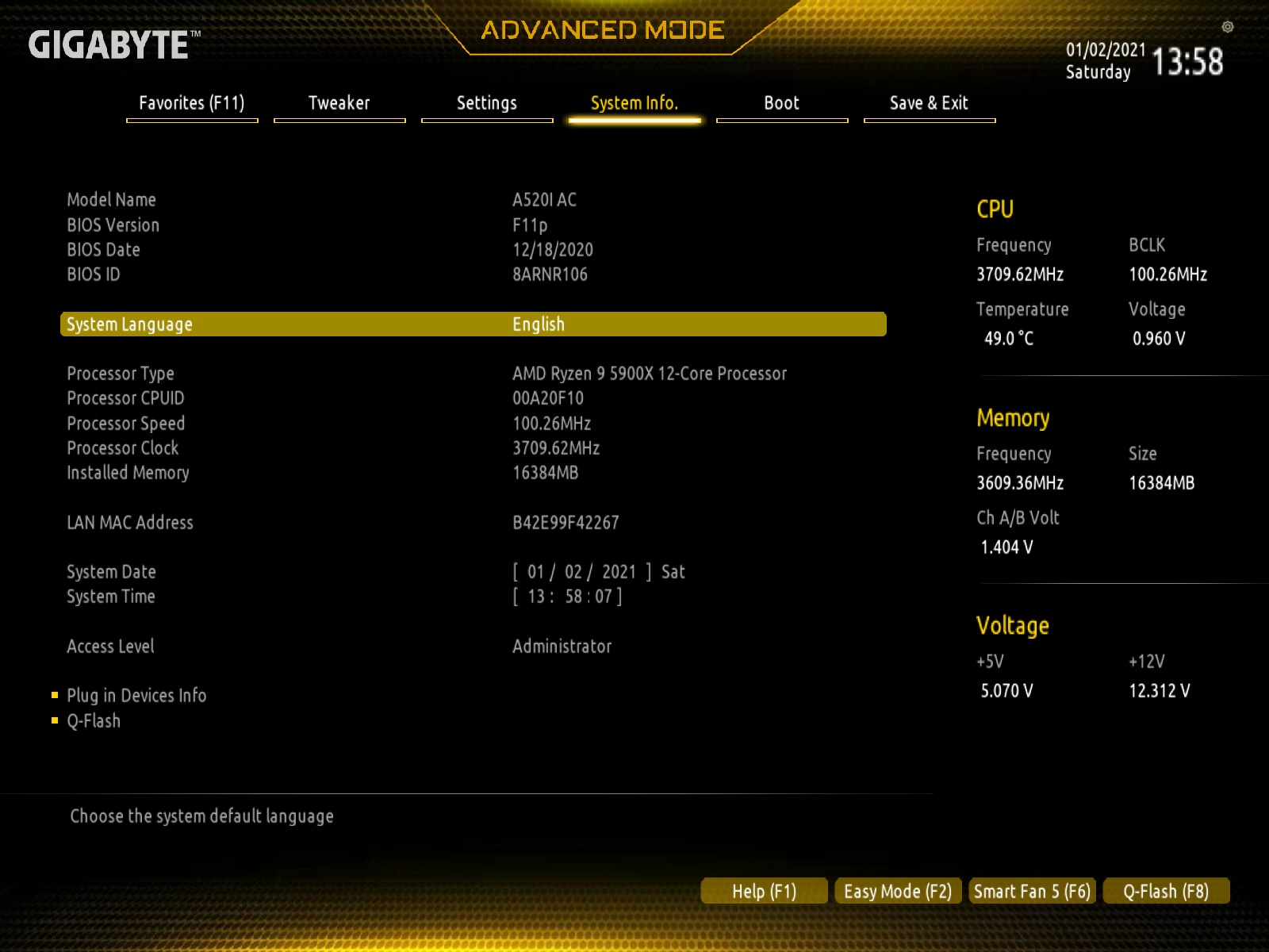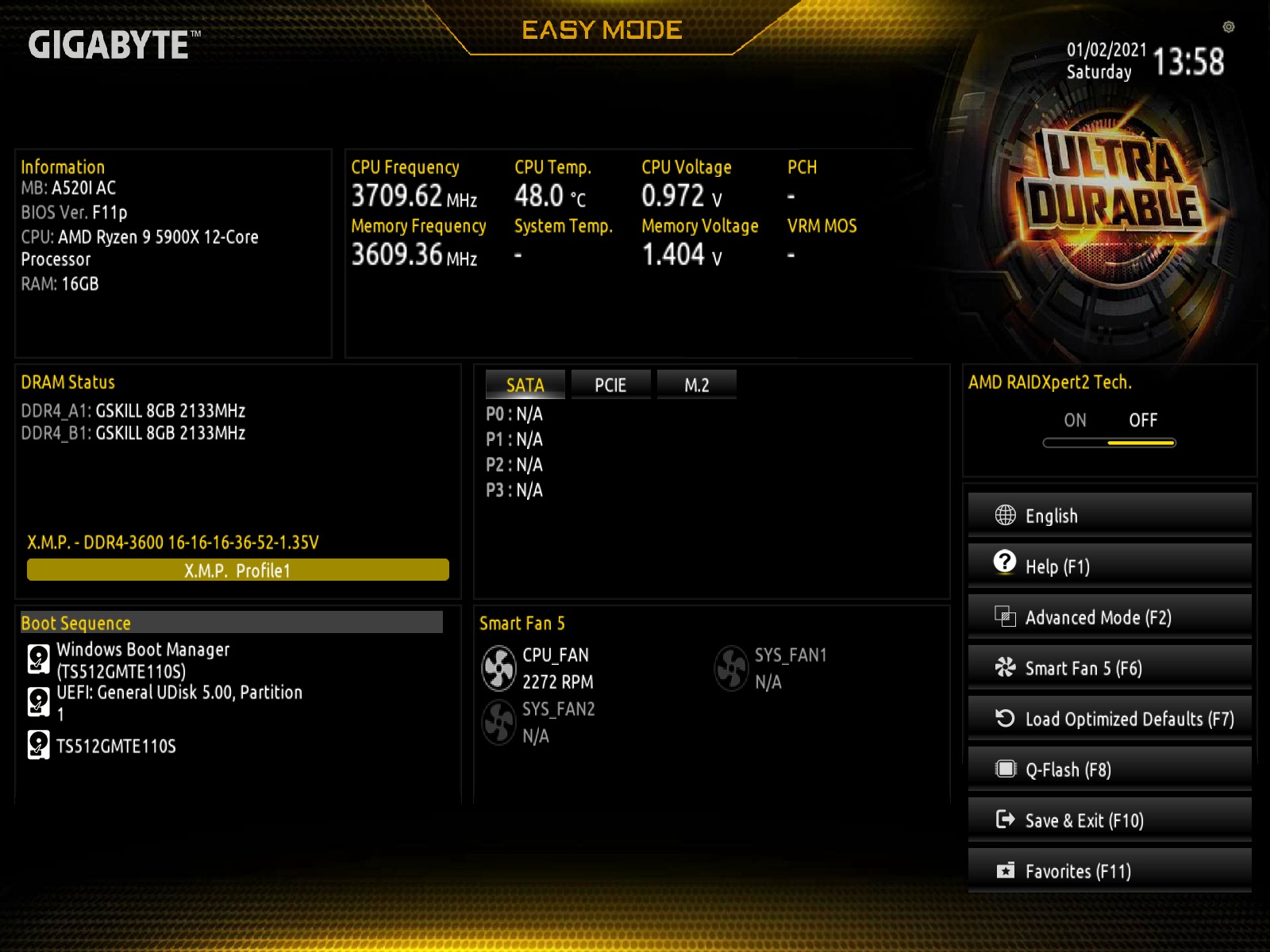 The UEFI BIOS on the GIGABYTE A520I AC comes in the same look and feel as the other motherboards from GIGABYTE. By default, users will be greeted with a Easy Mode interface, which can easily allow them to change basic setting such as memory profiles and boot priority. We could easily activate the 3600MHz XMP/DOCP profile on our memory without any hiccups.