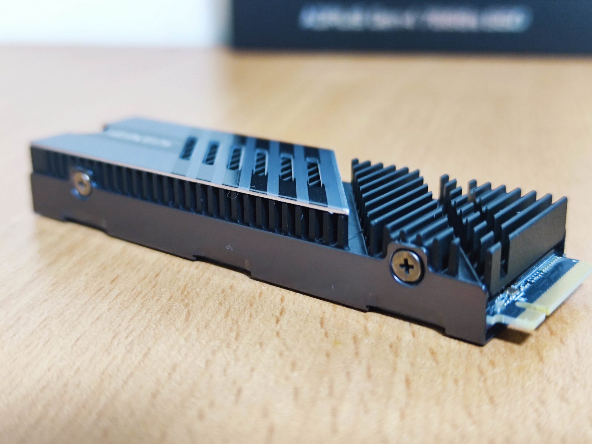 The AORUS Gen4 7000s NVMe SSD comes preinstalled with a heatsink setup. Rather than a bold golden design for the heatsink, GIGABYTE went with a more mainstream black and silver accented style this time.