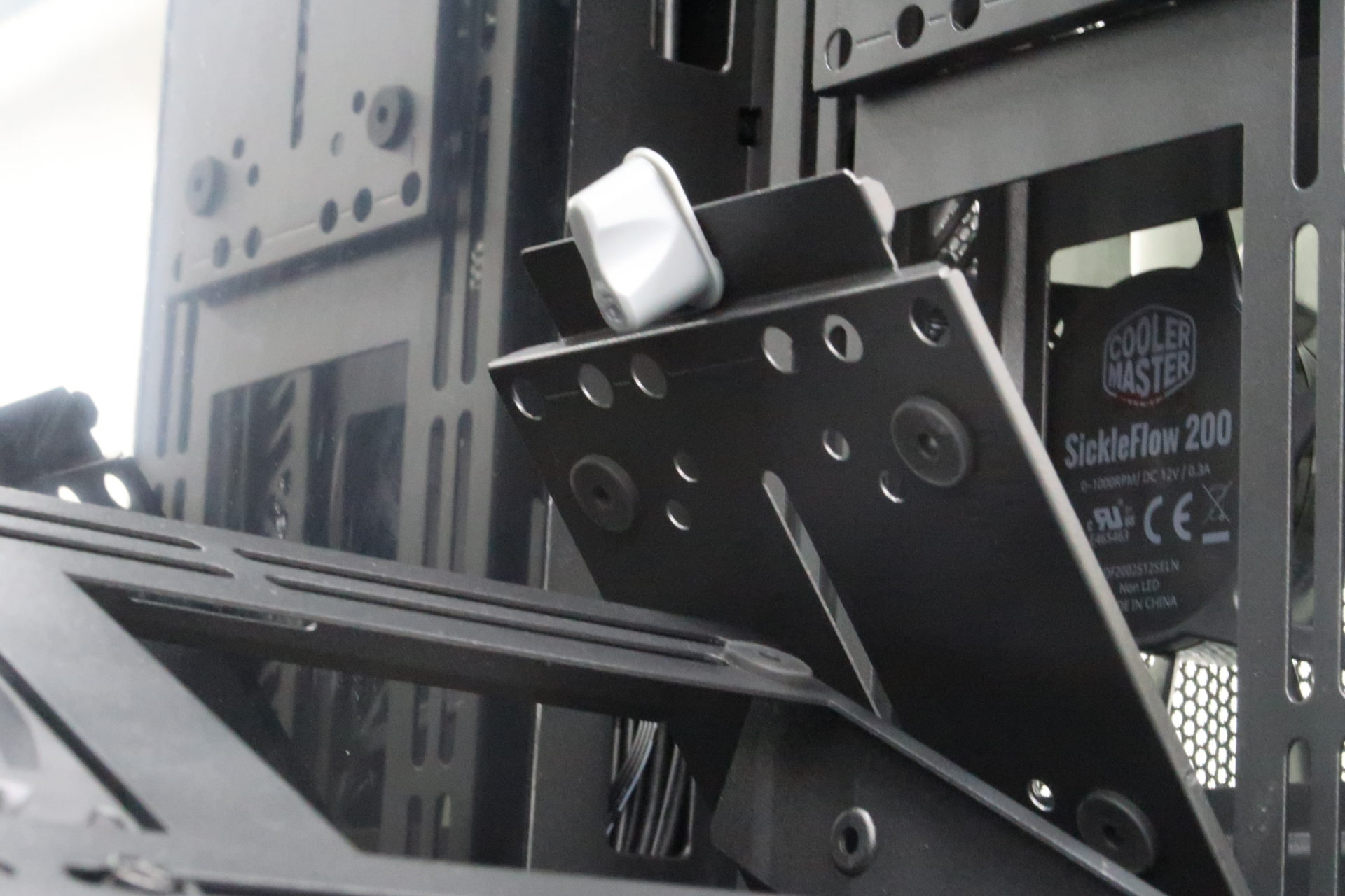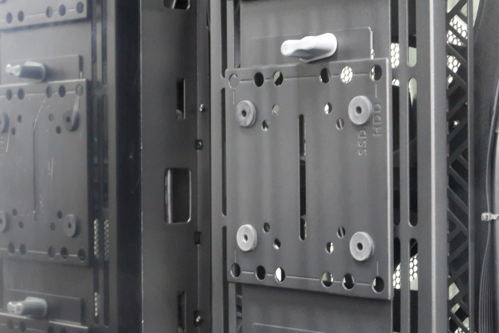 There are many components of the case which are removable. Some are secured by thumb screws, while others come with a uniquely designed gray tab which fastens the mount onto the case. By simply twisting the gray tab, the bracket will be removed, and you can then install your hard drive or fan onto them.