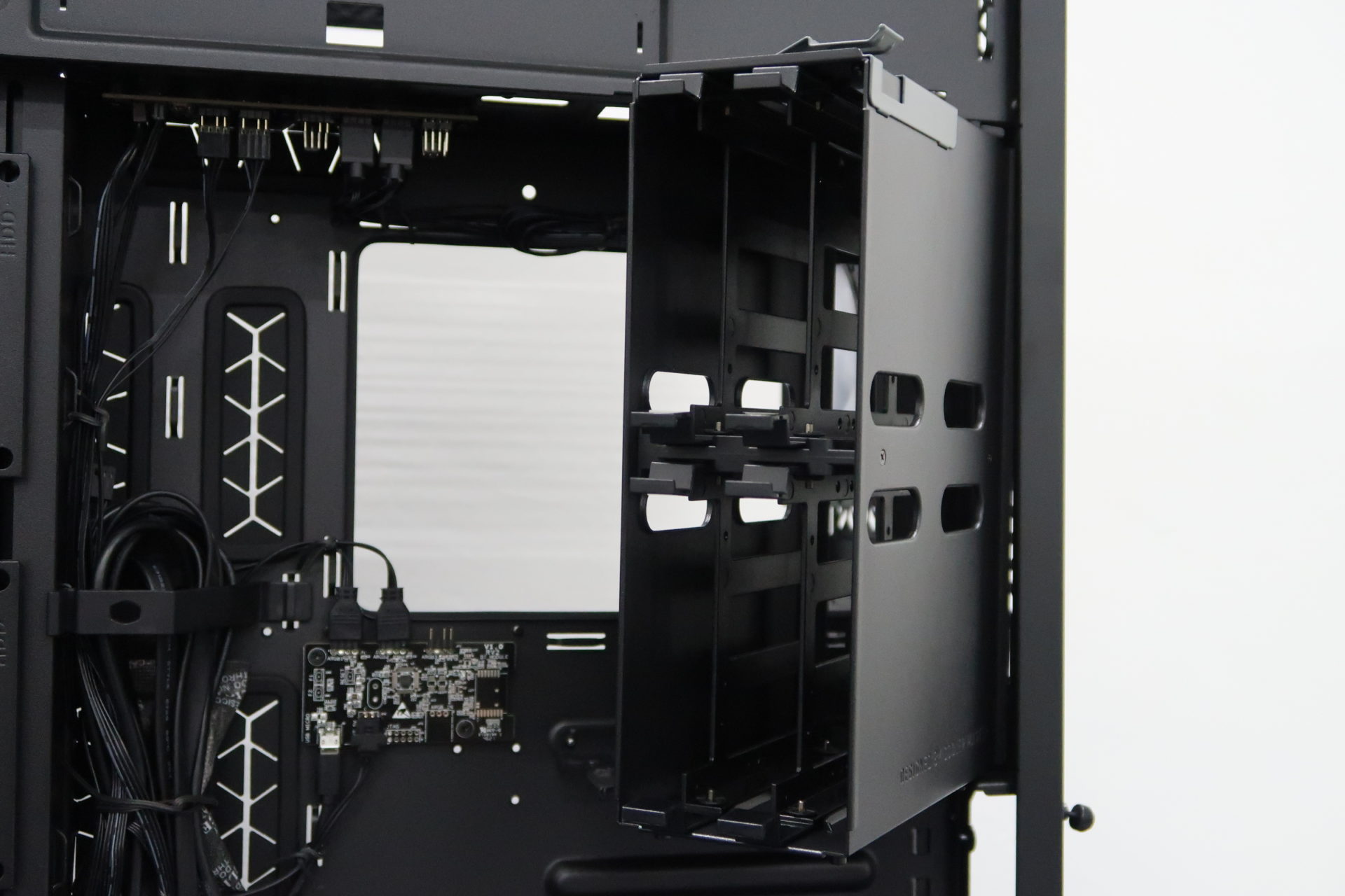 There is also a removable hard drive cage found on this side of the case. It can fit up to 4 more 3.5-inch hard drives. All installations of hard drives, and even the removal of the hard drive cage can be done tools free.