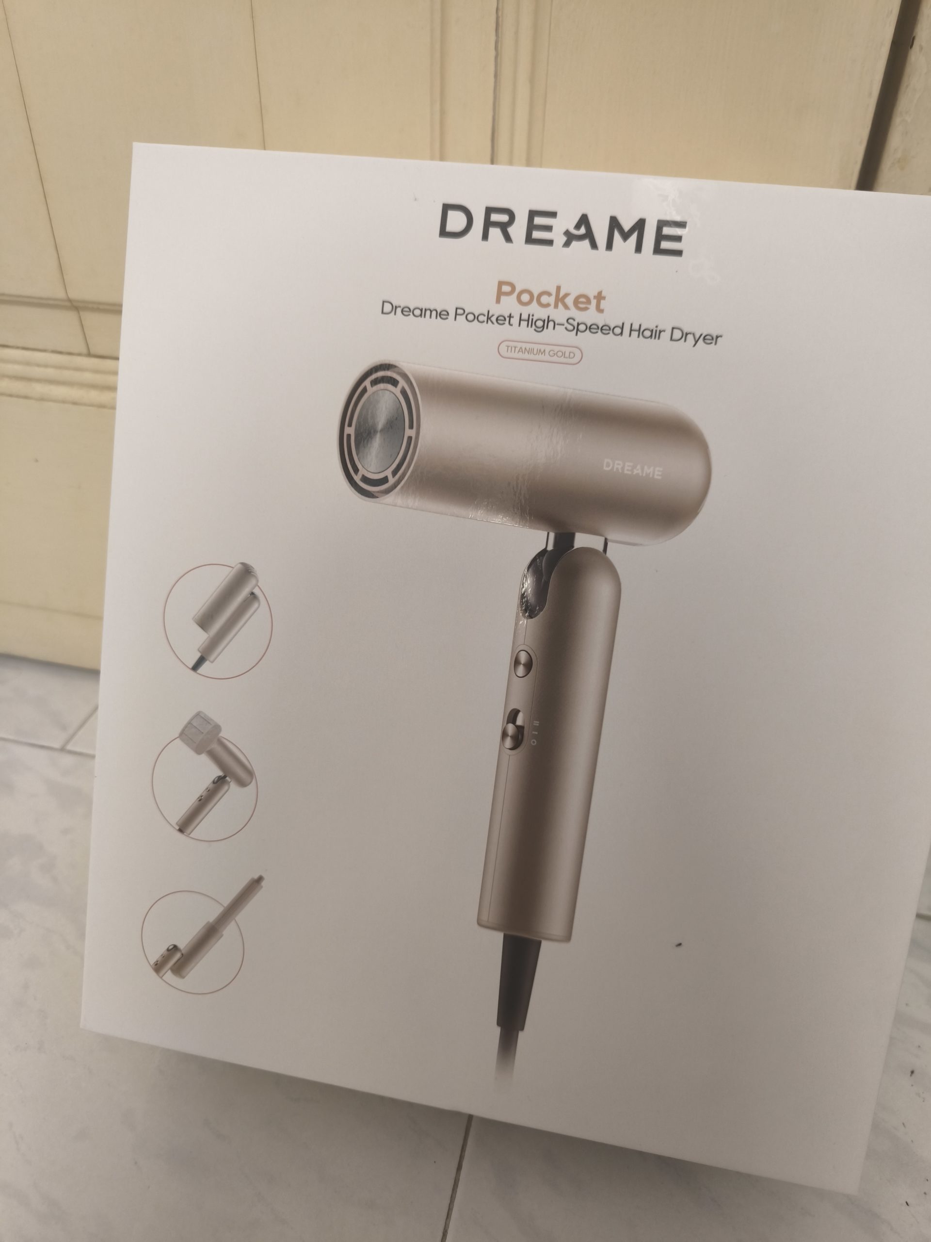 The Dreame Pocket Hair Dryer arrives in a stylish, compact box. Inside, everything is organized neatly, including the hair dryer itself, two nozzle attachments (unfrizz and curling), a storage bag, and the user manual.